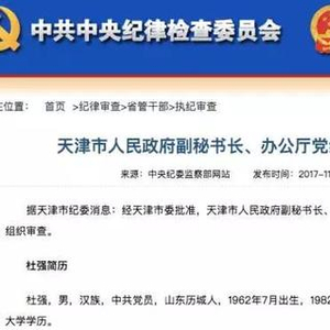据天津市纪委消息:经天津市委批准,天津市人民政府副秘书长、办公厅党组成员杜强涉嫌严重违纪,目前正在接受组织审查。