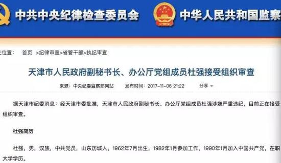 在天津市金融局任局长仅1年,杜强在2015年6月成为天津市政府副秘书长(正局级),2017年11月6日晚间,落马。