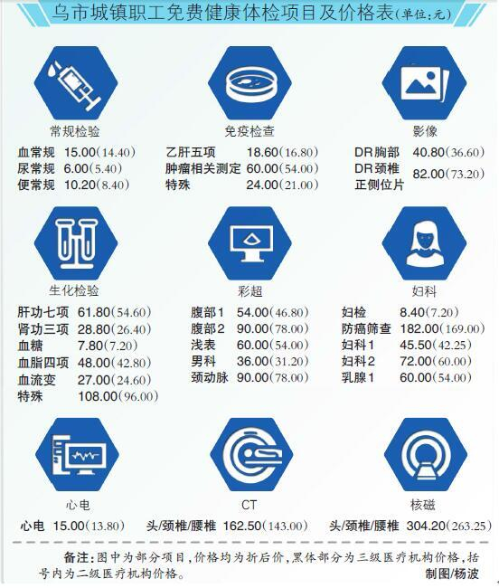 据了解,今年6月初,乌乌鲁木齐市出台社保惠民新政策,确定符合条件的33家医疗机构(17家三级医院和16家二级医院)为乌市城镇职工免费健康体检定点机构,从10月1日起,参加乌市城镇职工基本医疗保险,且参保缴费期间连续2年以上未住院的城镇职工及灵活就业参保人员(1-6级优抚对象除外),可在定点体检医疗机构进行免费健康体检,按照人均600元标准执行。两年以上未住院且未参加体检人员,按每增加一年,体检标准上浮200元执行,最高不超过1000元。体检或出院后时间重新计算。2017年按照人均600元起始标准执行。体检经费由医保基金支付。