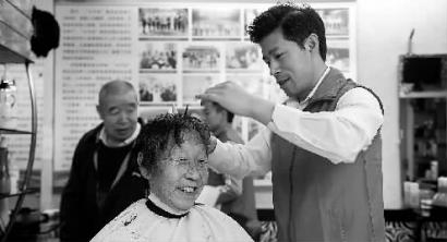 对于刘建军来说,这样的老顾客不在少数。店里还坐着一位大娘,她在这理发十几年了,最近患上股骨头坏死,要住院做手术。入院前一天,她赶紧来理个发。