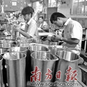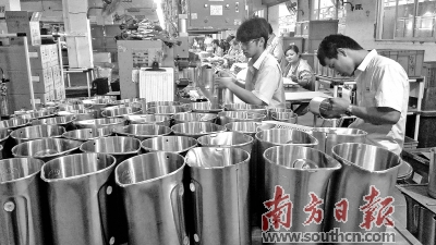 数据显示,全国酒店用电热水壶市场中,格来德销量第一。图为格来德生产车间。 盛正挺 摄