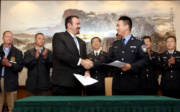 2017年10月16日,公安部国际合作局代表(右)和美国司法部法警局代表签署一名美籍红通逃犯的移交备忘录。(新华社)