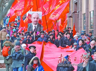 图为7日,在俄罗斯莫斯科,人们参加纪念十月革命100周年游行活动。