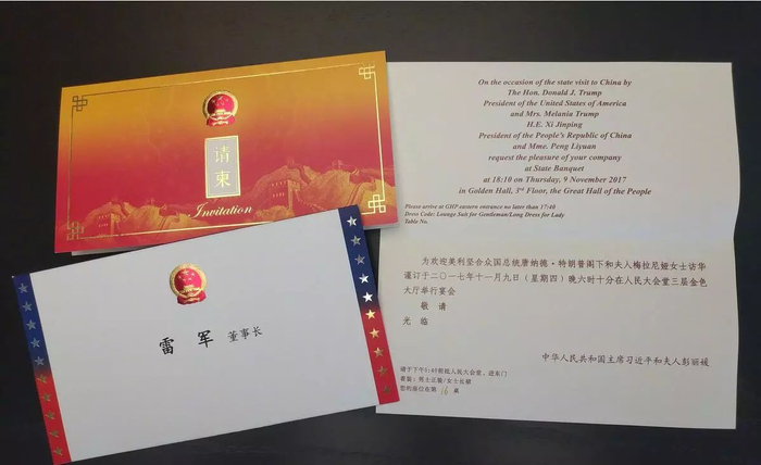 11月9日下午13时41分,受邀出席晚宴的小米公司创始人、董事长兼CEO雷军披露了国宴邀请函:为欢迎美利坚合众国总统唐纳德·特朗普阁下和夫人梅拉尼娅女士访华瑾订于二〇一七年十一月九日(星期四)晚六时十分在人民大会堂三层金色大厅举行宴会。
