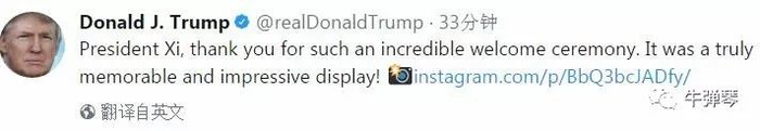 意犹未尽的他,随后还发了这样一条推特:中国领导人,谢谢您准备的这样一个令人难以置信的欢迎仪式,这是一场真正令人难忘和印象深刻的表演。在推文的末尾,有心的特朗普,还加上了一个“带有闪光灯的相机”的表情符号。