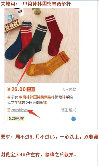 记者随机联系一个浙江绍兴的“主持”。他给记者发来自己店铺一款“韩版长袜”的产品截图,截图显示的销量为“0”。对方要求收藏店铺、收藏店家、浏览超过两分钟、假聊以及现场拍下产品等。