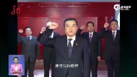 面对鲜红的中国共产党党旗,张庆伟领誓,其他领导同志举起右手、握紧拳头,重温入党誓言。