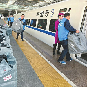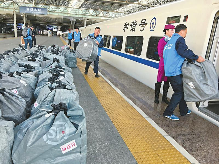 8点半,D2256次动车从成都东站发出,当日21时许将抵达南京。“当地的中铁快运网点组织车辆将快件转运到电商手中。”中铁快运成都站营业部书记康峰介绍,今年,高铁快运实行“站到站”货物运输服务,即上门接件、送件上门,与以往的“库到库”相比,货物运输由铁路部门统一组织、调配,不仅服务更贴心,也能确保货物当天即可送达。