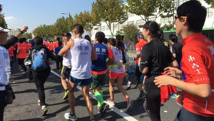 在今年上马3.8万参赛选手中,就有这样一群人,他们的视力受损,甚至完全失明,却依然怀有突破极限的决心;也有这样一群人,放弃实现个人成绩突破的机会,成为视障跑者的“眼睛”,携手奔跑。他们来自蓝睛灵视障陪跑团队。