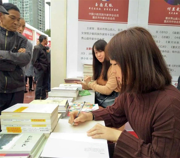 在秀山作家协会展棚内,秀山作家孙因的《凤头大姐》《秦良玉》、吴加敏的《花灯》、宋亚军的《两条河流》、玉面灵狐的《生死汶川》等30余部优秀作品呈现在广大市民眼前。