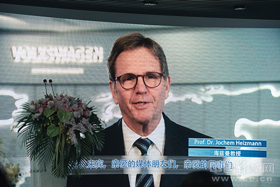 大众汽车集团管理董事会成员、大众汽车集团(中国)总裁兼CEO海兹曼通过视频发表演讲 郭跃摄