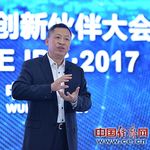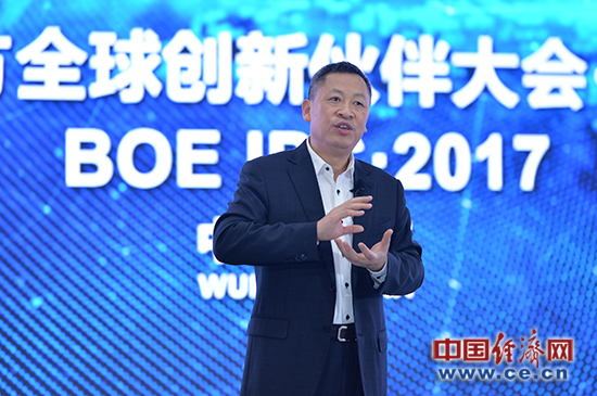 BOE(京东方)首席执行官陈炎顺在BOE全球创新伙伴大会·2017上发表演讲。(京东方供图)