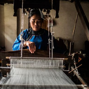 74岁的杨秀英(音)坐在木质的织布机下开始织布,随着她的手指在橙色的梭子上经过细细的棉线穿梭,这台破旧的织布机又焕发了生机。她不比织布机高多少,她越过孙女的肩膀检查新产出的织物,看有没有什么瑕疵。杨秀英自从是一个小姑娘时就开始编织并给织物靛蓝染色,所用的是贵州南部侗族几代人来母女相传的技术。
