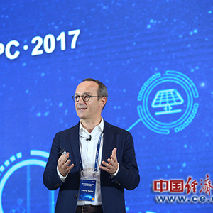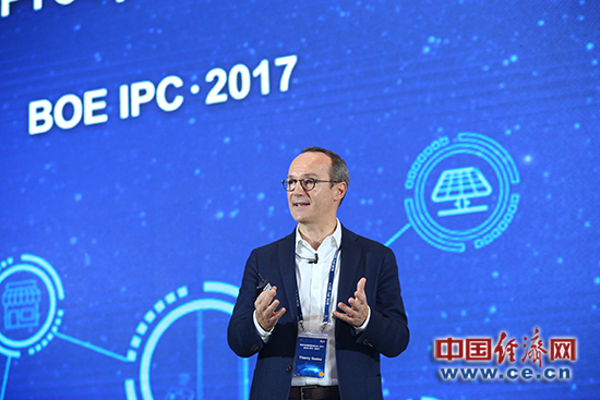 BOE(京东方)智慧系统事业群智慧零售解决方案负责人、SES-imagotag首席执行官Thierry Gadou在下午进行的智慧系统论坛上发表演讲。(京东方供图)