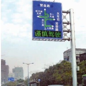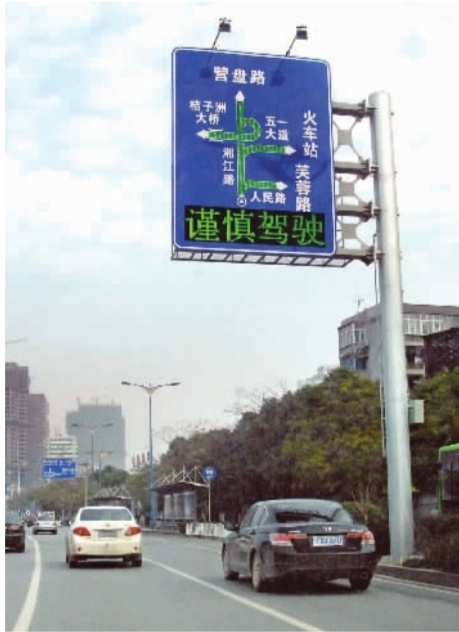 车辆从长沙市湘江路新安装的交通诱导电子指示牌下通行。指示牌通过感应自动计算车流量,采用文字和图形发布诱导信息,提示司机选择合理路线行驶。(资料图片)