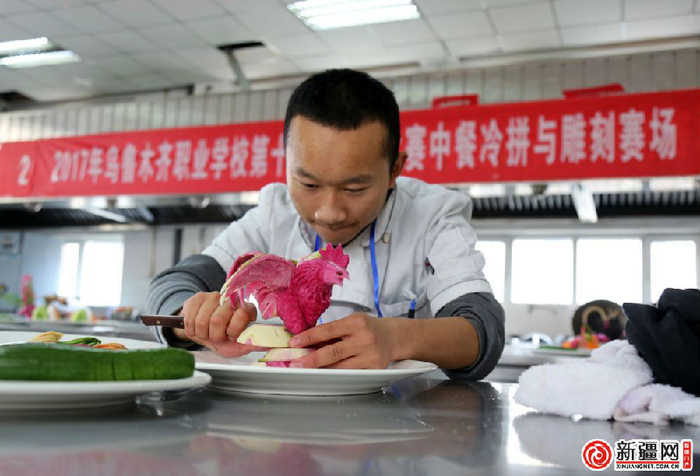 在技能大赛中,参赛选手在制作冷菜雕刻作品《雄鸡报晓》