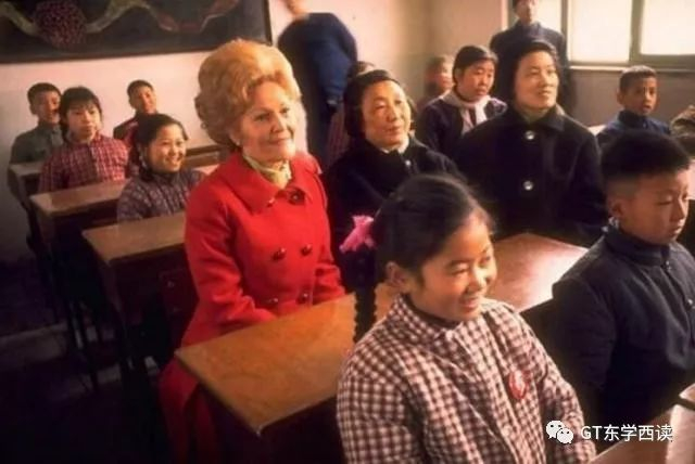 随尼克松访华的美国时任第一夫人帕特·瑞安·尼克松拥有一头标志性的金发。作为第一夫人,当尼克松总统与毛泽东、周恩来等中国领导人举行会晤时,帕特·尼克松就会穿着自己的红色外套游览北京城,并曾到一所公社学校与学生们一起听课。不过,由于时间久远,小编已经无法查到帕特·尼克松具体前往了哪所学校。
