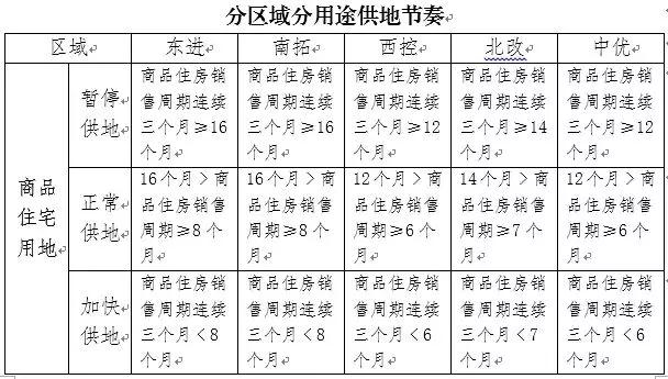 将商品住宅用地供应节奏与商品住房销售周期挂钩,针对“东进”、“南拓”、“西控”、“北改”、“中优”等区域,实行差异化供地节奏把控。