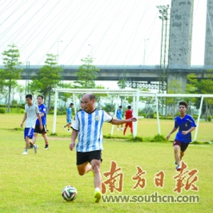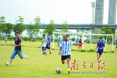 近年来,三水不断加大公共体育领域投入,打造多元化体育平台,推动建设体育强区。图为市民在三水体育公园踢球。张秀蓝 摄