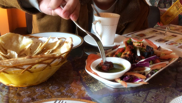 当天,小刘和朋友来到这家位于黄桷坪正街的印度餐厅吃饭,想感受下异域风情。上菜过后,小刘发现菜里面搭配了一款绿色的酱料,看上去像是青椒酱,也有点像芥末,看着很有食欲。