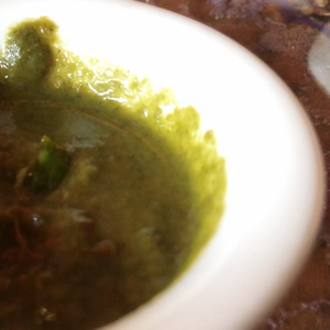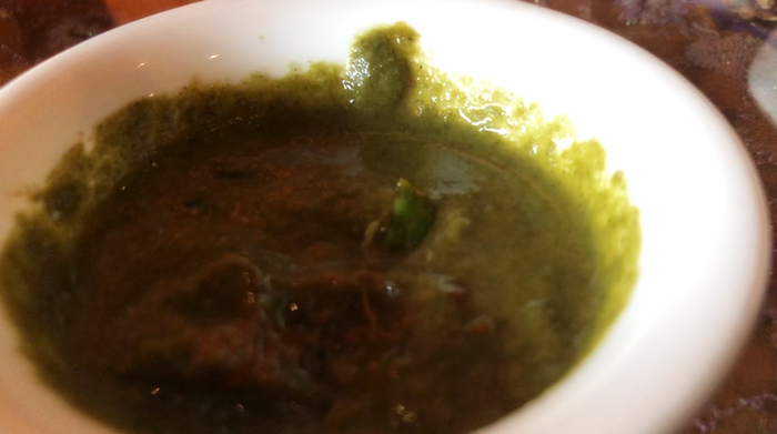 于是大胆的尝试着吃了一口,发现这款酱料的味道相当奇特,是自己从来没有吃过的那种。又不辣又不甜,口中的余香令人百感交集,不可描述,感觉有点熟悉,但又叫不上名字。后来老板前来介绍说,这款酱汁是将薄荷与香菜碾在了一起,经过特殊的处理制成的,非常有特色。