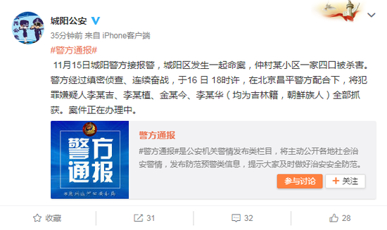 法制晚报·看法新闻(记者·贾鹏) 据@城阳公安官方微博发布消息,11月15日城阳警方接报警,城阳区发生一起命案,仲村某小区一家四口被杀害。警方经过缜密侦查、连续奋战,于16日18时许,在北京昌平警方配合下,将犯罪嫌疑人李某吉、李某植、金某今、李某华(均为吉林籍,朝鲜族人)全部抓获。案件正在办理中。