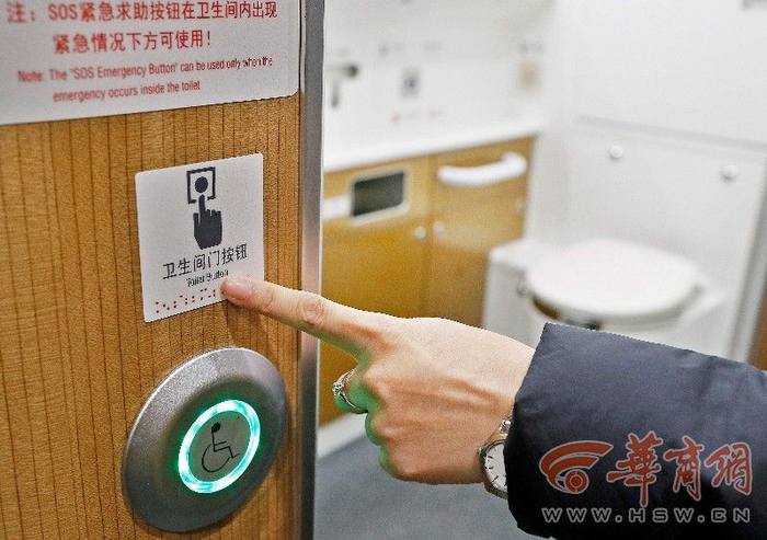4号车厢设置有方便残疾旅客的无障碍设施和残疾人卫生间,提示牌上印有盲文