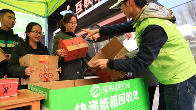 自11月12日起,菜鸟物流联合中华环境保护基金会启动了“回箱计划”。废旧纸箱回收活动在北京、上海、广州、深圳、杭州等10个城市、数百个驿站同时展开,消费者通过扫描二维码参加活动,捐赠10个纸箱,菜鸟就会联合公益组织以其个人名义种一棵树。上海财大的驿站活动第一天就回收了超过1000个纸箱。