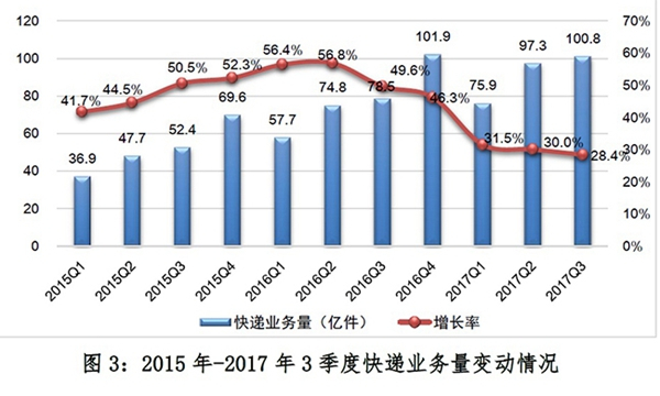 中国已成全球第一快递大国。2016年在全球约700亿件的快递量中,中国占了300亿件。国家邮政局相关报告显示,2017年前三季度累计完成快递业务量273.9亿件,预计全年业务量将达到400亿件。