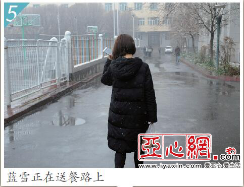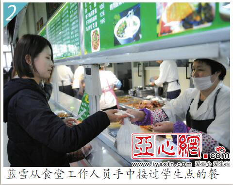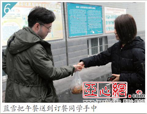 亚心网讯 (文/记者董潇涵图/记者喻义昌)“同学,你的饭送到了。”昨日,雨夹雪,“送餐姐”蓝雪刚从校门口的一家饭店取上一份热气腾腾的米粉,一路快走送到了女生宿舍5楼548宿舍的“顾客”手中。