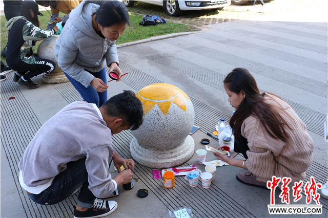 在同学们的共同努力下,经过几小时的精心“装扮”,这些原本毫不起眼的路障石墩变得鲜活生动了。惟妙惟肖的少数民族形象、搞怪抽象的线条画、经典可爱的卡通人物等图案形象逼真、色彩鲜艳,成为校园一道独特的风景线。