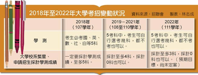 据了解,按照先前的规定,台湾学测必考5科,通过“繁星计划”及“申请招生”途径入学,最多将考核5科学测成绩。而如今为减轻学生压力,2019年起,考生参加学测可自主选择要考几科、甚至可以不考,相关科目也会降低至最多4科。