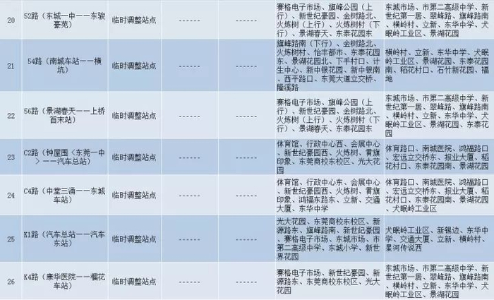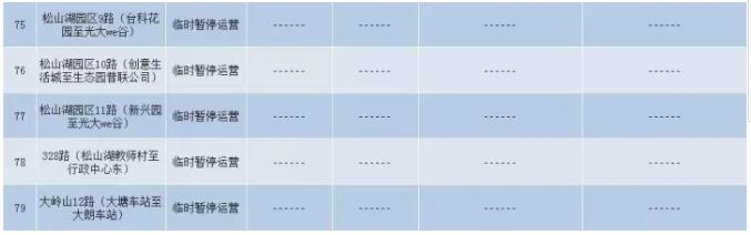 城巴1路、9路、14路、15路、18路、19路、21路、23路、24路、27路、31路、34路、35路、36路、37路、41路、46路、49路、51路、52路、54路、56路、C2路、C4路、K1路、K4路、LG1路;东莞巴士801路、805路、805A路、825路、827路、829路、830路、833路、837路、850路、851路、862路、868路、869路、872路、873路、875路、L6路、公交快线21路;小巴X2路、X5路、X6路、X7路、X9路、X11路、X12路、X13路、X17路、X20路、X22路;寮步A1路、A2路、A3路、A6路、A7路、A9路、A10路。共有15条公交线路需临时暂停运营,分别是东莞巴士835路、858路;松山湖园区1路、2路、3A路、3B路、4A路、5路、6路、7路、9路、10路、11路、328路和大岭山12路。