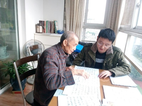 易良军与著名作曲家黄虎威讨论作品 受访者供图“《不忘初心》创作于今年上半年,是为十九大献礼而作,由作家何真宗作词。”易良军介绍道,该乐曲分为二部曲式,前面主要述说党的成长历程,二部分音乐在节奏,音区及力度上形成对比,热情洋溢地歌颂了党的光辉。而另一首《中国茶》则创作于去年,乐曲从龙井岳飞剑,普洱情歌等意像自如地嵌进歌词中,对中国传统文化作了很好的宣传。