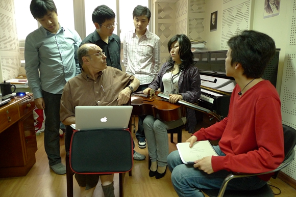 易良军在美国著名作曲家塞缪尔•阿德勒(Samuel Adler)大师课上学习 受访者供图“曾几何时,我们的先辈唱着《保卫黄河》奔赴战场,唱着《我们新疆好地方》建设新疆,我们就是应该多唱《我的中国心》《龙的传人》这类增强中华民族凝聚力的优秀歌曲。”易良军补充道:“像《桃花朵朵开》《老婆老婆我爱你》这类作品不值得欣赏,我也会自觉远离。”