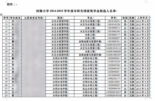 其中,河海大学曾对2013年度国家奖学金获奖学生初审名单以及2014、2015年度本科生国家奖学金候选人名单进行公示时,在公布了学生的姓名、院系、专业、学号、性别、民族、入学年月之外,还公布了学生完整的身份证号码。