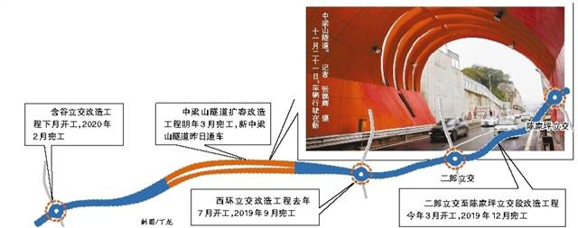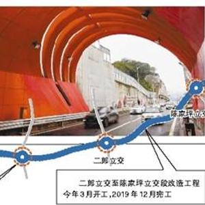 二郎立交至陈家坪立交段改造工程总投资约6.2亿元,拟将主线道路由现有双向4车道拓宽为双向8车道,两侧另外各设置2车道的辅道与周边路网连接,其中成渝主线长约3.7公里,今年3月开工,计划2019年12月完工。