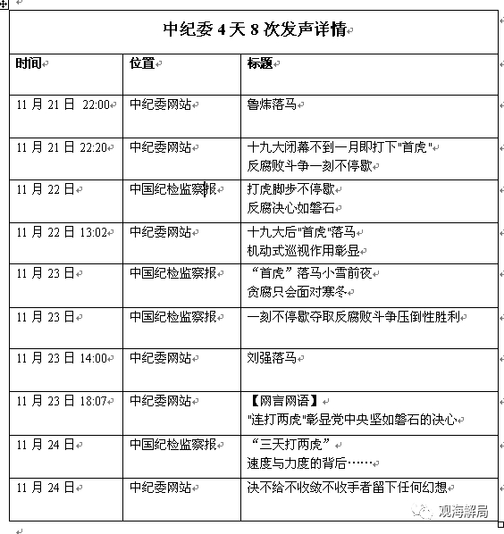 除了“又快又有料”,中纪委网站最近的新特点之二是密集发声。正如上文所述,鲁炜落马当天(11月21日)发文表态、第二天(11月22日)揭秘,刘强被查后当天(11月23日)第一时间集纳舆情,第二天(11月24日)刊发专评“决不给不收敛不收手者留下任何幻想”。