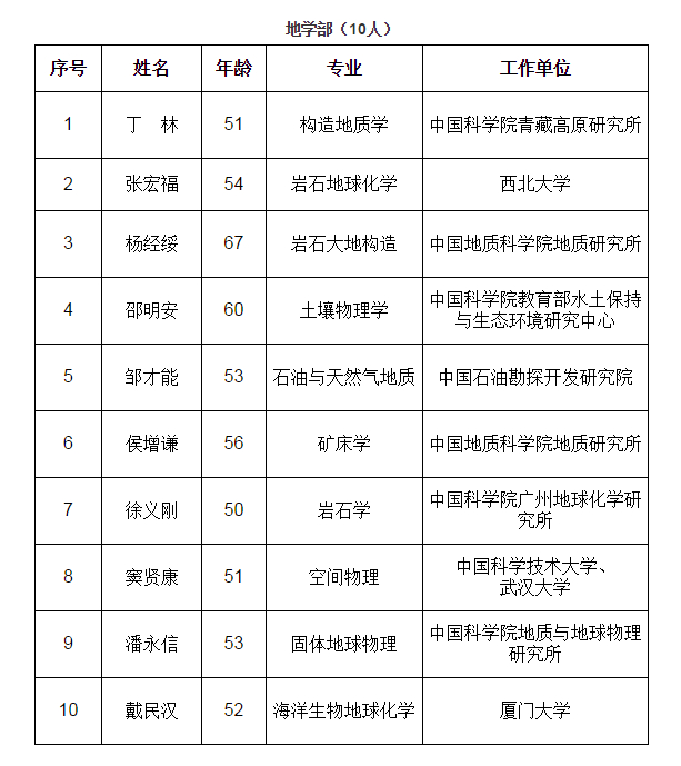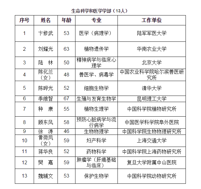 61位新增选的院士中,数学物理学部11人,化学部9人,生命科学和医学学部13人,地学部10人,信息技术科学部6人,技术科学部12人。在新当选的61名中国科学院院士中,男性58人,女性3人。新当选院士平均年龄为54.1岁,最小年龄46岁,最大年龄67岁,60岁(含)以下的占91.8%。