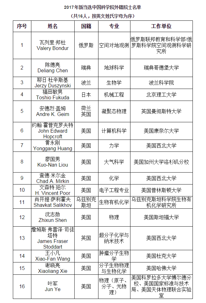 根据改进完善院士制度方案关于适当增加外籍院士名额的要求,中国科学院今年新增选外籍院士16人。其中,安德烈·盖姆和詹姆斯·弗雷泽·司徒塔特为诺贝尔奖获得者。新当选外籍院士来自8个国家,波兰、荷兰、乌兹别克斯坦3国首次有科学家当选中国科学院外籍院士。在坚持外籍院士标准的前提下,重点关注“一带一路”沿线国家候选人,中国科学院外籍院士的国别分布也更趋合理。