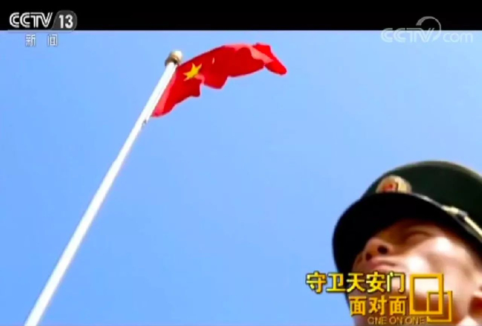王建华:首先他是在特殊的岗位、区位上,在天安门,我们升起这面国旗,长5米宽3.3米,是全中国升起的最大一面国旗。另外这面国旗,也是1949年毛主席在天安门城楼上亲自按动电钮升起的这面国旗,所以我们感到国旗代表着祖国,又是国家的象征,我们感到这是祖国第一旗,也是祖国第一哨。
