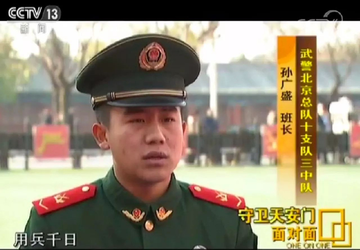 孙广盛,武警北京总队十支队三中队班长,2012年12月份入伍,被分配到武警北京总队十支队,十支队主要担负天安门城楼、国旗、人民英雄纪念碑、金水桥、国家博物馆、故宫博物院等重要目标的警卫守卫,中央首长、重要外宾在广场地区重大活动临时现场、路线警卫,国旗护卫、天安门地区巡逻防控等任务。