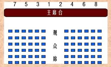 主席台座次安排,领导为偶数时,1、2号领导同时居中,2号领导依然在1号领导左手位置,3号领导依然在1号领导右手位置。可参见下图的座次排列: