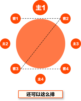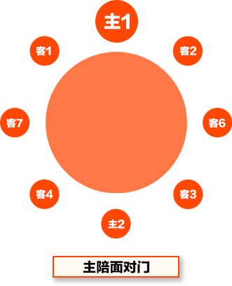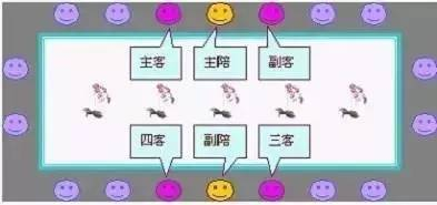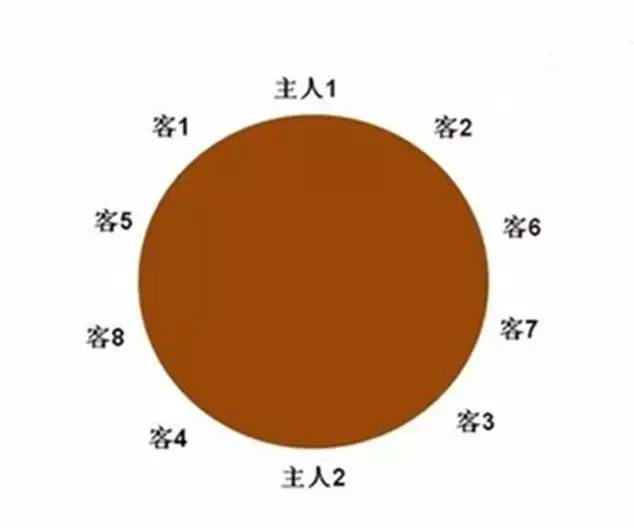 宴请客人,一般主陪在面对房门的位置,副主陪在主陪的对面,1号客人在主陪的右手,2号客人在主陪的左手,3号客人在副主陪的右手,4号客人在副主陪的左手,其他可以随意。可参见下图的座次排列: