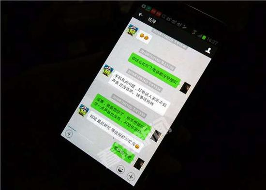 杨妈妈向记者展示当时朱晓东用手机假装女儿与自己聊天的记录。 摄/记者 杨小嘉