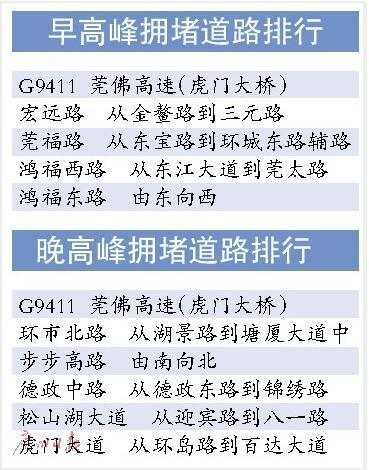第三季度,东莞哪些路段堵车严重?以下是名列前茅者:虎门大桥、宏远路、莞佛路、步步高路、环市北路。
