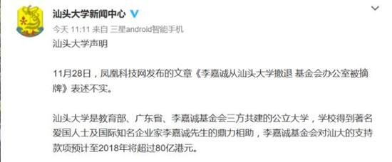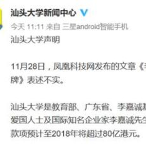 11月28日,有媒体称,李嘉诚在汕头大学的基金会办公室已经被摘牌,因为与学校相关问题达不成一致意见,李嘉诚就此撤退。