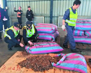 在大鹏海关的查验场,记者看到一个集装箱内塞满了红蓝相间的编织袋。海关人员拉出编织袋用刀划开,鳞片一下子就从里面泻出来,这些灰黑色的鳞片大多6厘米~7厘米长,“这是非洲穿山甲的鳞片”,海关人员说。