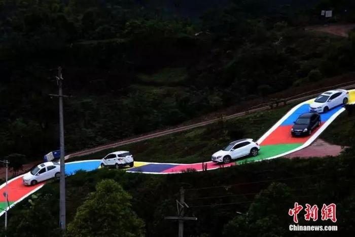 重庆涪陵有沿山而建的“彩色S型公路”,该公路总长100多米,宽度5米,车辆只能下行,限速每小时5公里。就问你:美不美?!亮不亮?!