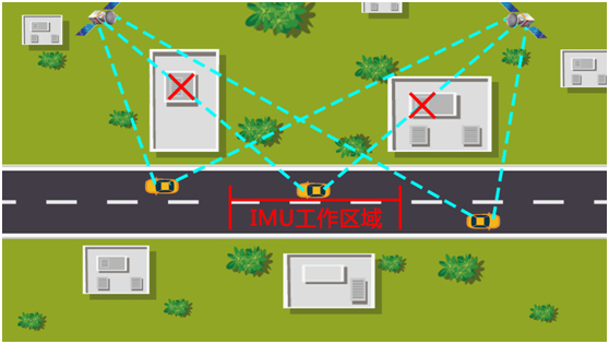 在该图中,自动驾驶汽车驶入高楼林立的区域,失去了卫星信号,无法由GPS提供绝对定位,此时,IMU可以发挥其延续绝对定位的作用,在没有GPS信号的区域为汽车提供绝对定位信息,这些信息包括汽车的实时经纬度和海拔高度。